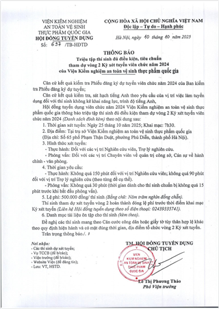 Thông báo Triệu tập thí sinh đủ điều kiện, tiêu chuẩn tham dự vòng 2 Kỳ xét tuyển viên chức năm 2024 của Viện Kiểm nghiệm an toàn vệ sinh thực phẩm quốc gia