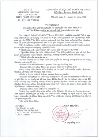 Thông báo công nhận kết quả trúng tuyển Kỳ xét tuyển viên chức năm 2024 của Viện Kiểm nghiệm an toàn vệ sinh thực phẩm quốc gia